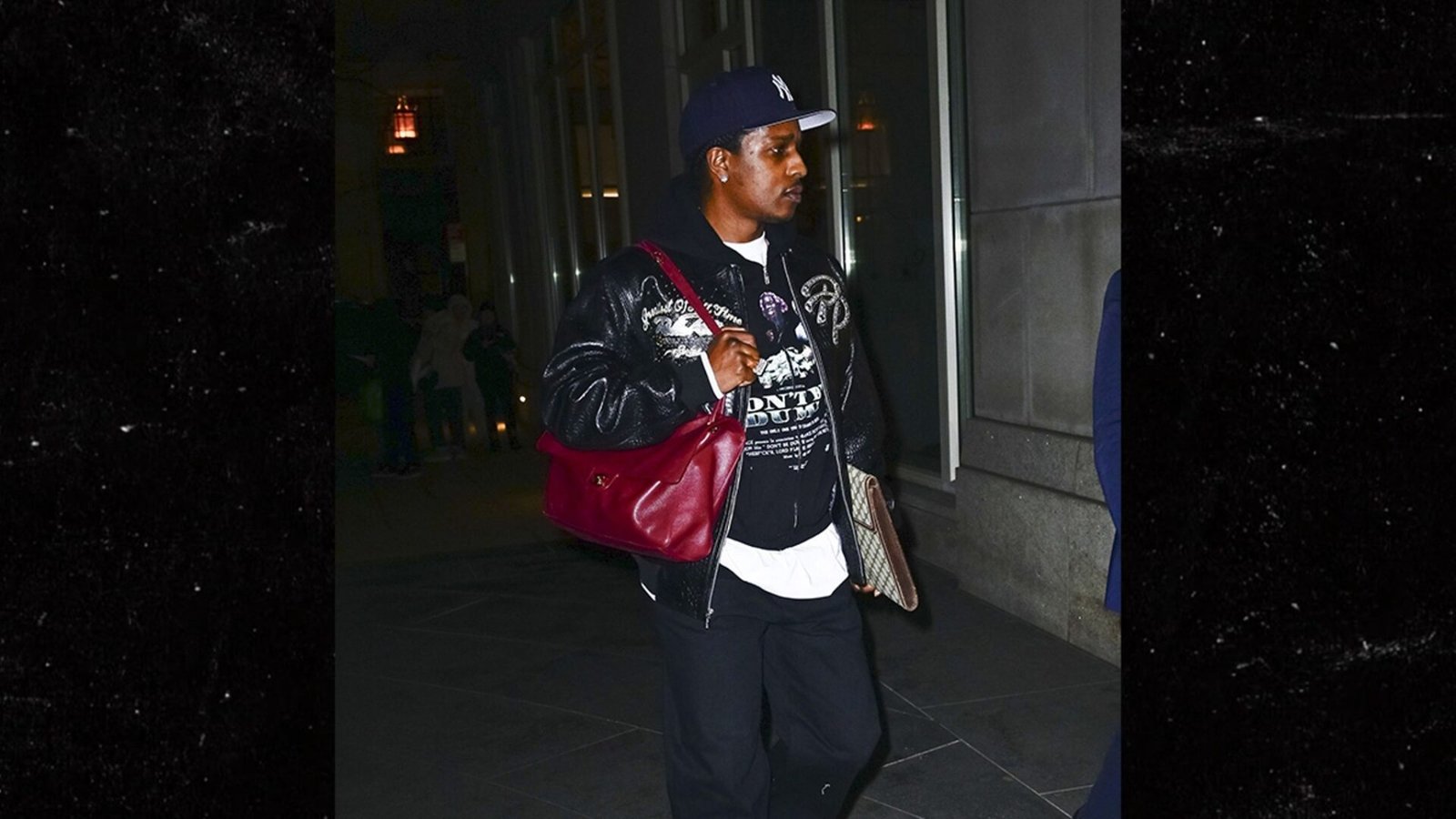 Na ocasião, A$AP Rocky estava com um grande bolso de couro vermelho pendurado em seu ombro. Ele complementou seu visual com uma jaqueta gráfica sobre um moletom, exalando um estilo descontraído, mas ainda assim muito fashion. As fotos mostram que, mesmo em um momento de tensão, ele continua a se apresentar com elegância.
